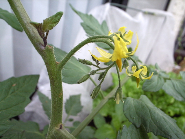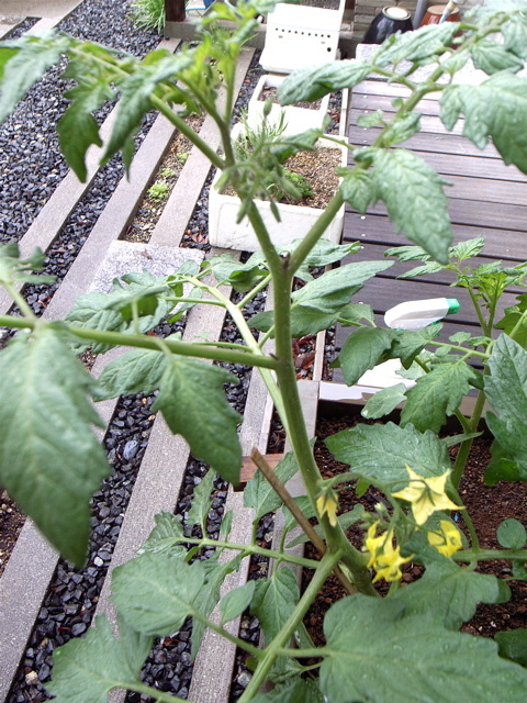 ところで、ミニトマトって、よく観察すると面白いことに気づきます。花が付くとかならずその後は、葉、葉、葉、花の順で葉と花が繰り返します。写真ではわかりにくいかもしれませんが、一番花と二番花の間がそうなっていますよね。どの苗を見てもまずまちがいなくそうです。DIY-PLANTERの残り二株もそうです。