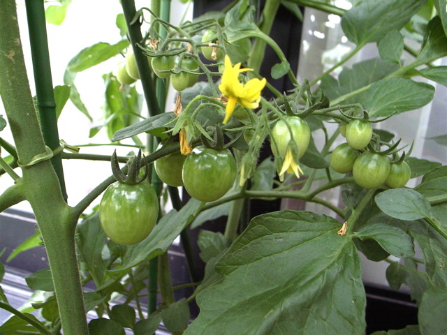 さてさて、ミニトマトですが、さすがにまだ赤くはなっていませんが、鈴なり状態です。これも、ほんとうに楽しみです。そばのピーマンにも小さな実がつきはじめました。