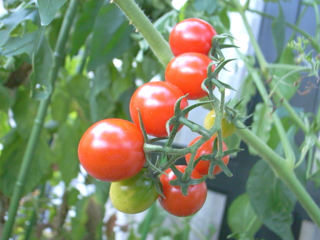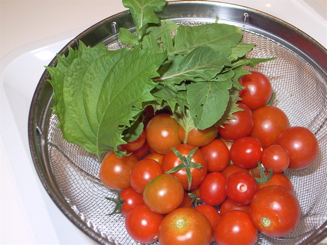 トマトのキャッチコピー、というわけではありませんが(^^)、太陽が降り注ぐとミニトマトは元気になります。その正直なこと!このところ日差しに恵まれたおかげで、プランターのミニトマトがあっという間に真っ赤に色づきました。すばらしいですねえ、カメラを赤飛びさせるこの元気な赤色(^^;)。収穫するうちに日没を迎えたので、屋内で収穫物を撮影しました。ミニトマト、シソ、ルッコラ。アオムシに啄まれ、ルッコラはちっちゃいですけどね。ありがたく頂戴するとします! ごちそうさま。
