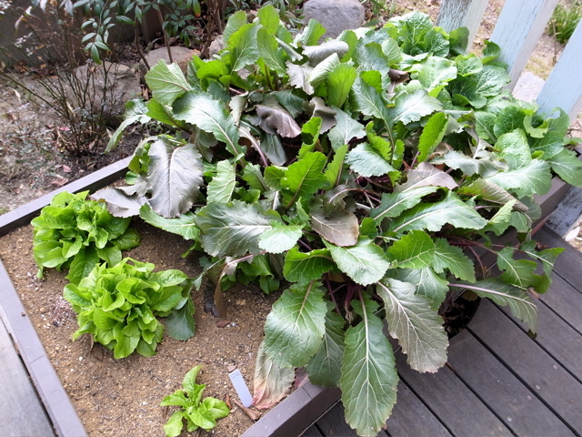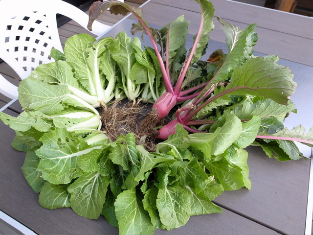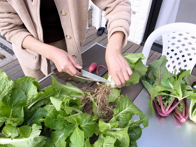 久々にクッキンガーデンのテーブルに野菜が並びました。ついでに、赤カブを二株抜いてみました。これも、ミニチュアサイズ。このまま洗って生で食べてみたところ、味はしっかりとカブそのものでした。