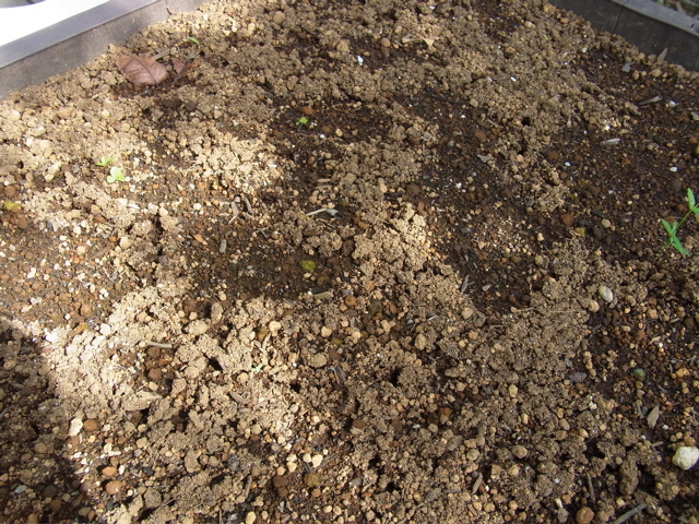 プランターの土の表面を見ると、線状に土が盛り上がった跡がありますが、これはコガネムシかカブトムシなどの幼虫が這った跡です。これらの幼虫は植物にあまり被害を与えないと思っていましたが、這っている深さはほとんど種蒔きした深さです。幼虫が種を食べたか、掘り返されて発芽できなかったのではなかろうかと・・・・想像。