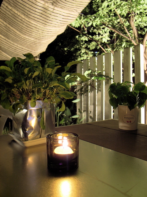 こちらは中国地方ですが、なかなか梅雨が明けません。そんななか、昨晩の庭は実に爽やか。室内にある湿度計は52%と表示しています。気持ちがいいわけだ!というわけで、食事のあと庭に出て、妻とデザートのスイカをいただきました。写真はそのひとこま。事前にシトロネラキャンドルをデッキに置き、蚊の侵入を阻止。その上で、雰囲気づくりにテーブルの上にもキャンドルを置いてみました。