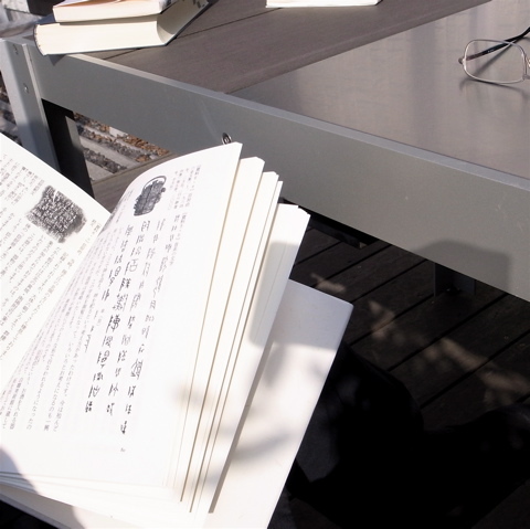 この季節、晴れた朝は絶好の読書日和です。風が吹くと花冷えって感じでくつろげませんが、朝の陽射しを背中に受けるとポッカポカ。北向きに座って、自分の影に文面を入れると、活字が目にちょうどいいコントラストになります。テーブルの本の側には、PCでも、iPhoneでも、化石号E61でもちょこんと置いて。無線LANがあれば、ちょっとした調べごとなら快適です。いちばんピッタリなのはツィートかも^^。庭からツィート、ぜひお試し下さい。