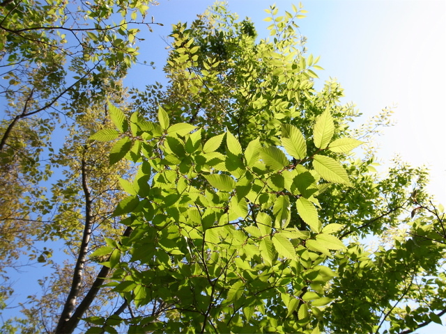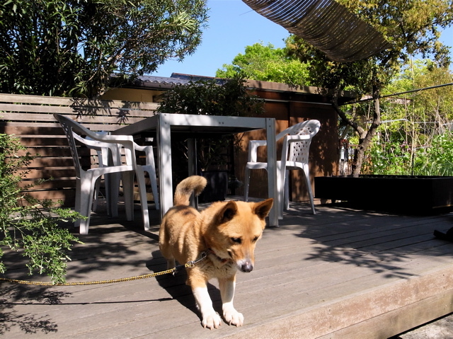 パンナのお父さん、お母さん、こんにちは。いよいよ「育てる土」で栽培開始ですね。どんな野菜をご予定ですか? 展開を楽しみにしています。ところで、屋上から見た庭、すごいですね〜。これが世田谷の、マンションの、しかも4階のテラスだとは! 何も知らずに写真を見たら、ぜったいに気付きませんね。こちらには屋上がないので、下から見上げた風景を。左は「みどりの日」にちなんで頭上のケヤキ、とうとう二階の庇を超えてしまいました。右はモモ(コーギーと柴のミックス)がバッタを見つけたところ^^