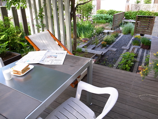 まだ庭に十分に光がまわらないまどろむような朝、庭に出て軽い朝食をとりました。あまりにも日常的な風景なので、ちょっとハズカシイ^^; 少しは写真を撮るらしくすればいいのだけど。でもまあ、庭にテーブルがあるとこうなりますという典型として。妻も私がこうして外で食べるのを歓迎。なぜかって、パンの粉がこぼれないから。ホントはこぼれるんですけどね、掃除しなくていいという理由で(笑)。
