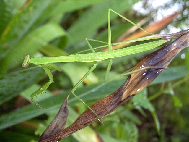 カマキリも庭の常連さんですね。もうひと月も前から姿を見せていましたが、親指の幅ほどの青いゼリーの楊枝が露骨に撮るにはしのびなく、なんとなくカメラを向ける事ができませんでした。ほんとは、小さすぎて撮りにくかったんでしょ、って? まあね、あはは(笑)。しばらく見ないうちに青年になっちゃいましたね。青のまぶしさといったら、若い蕗のように美しい。