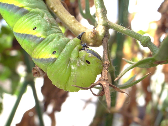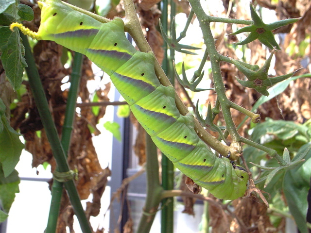 菜園の掃除をしていて、抜き取ったミニトマトの束のなかに、鮮やかな身体をくねらせたクロメンガタスズメの幼虫を見つけました。体長10センチ、実に立派なものです。そのまま放置すると踏むつぶすことになるので、指でつまんでDIY-PLANERのトマトにお引っ越し。ちゃんと成虫になれるかな。