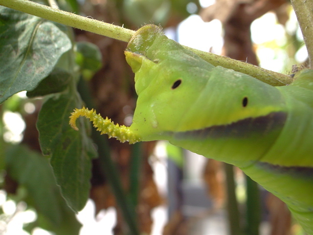 我が家の庭はどうやらスズメガのお気に入りらしく、幼虫も成虫もよくやってきます。前回はハバネロにぶら下がっていました。このスズメガ、蛾のなかではひときはカッコよくて、その姿はまさにステルス戦闘機。だからまあ、まんざらではありません(笑)。