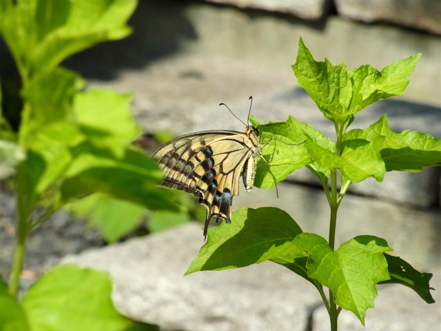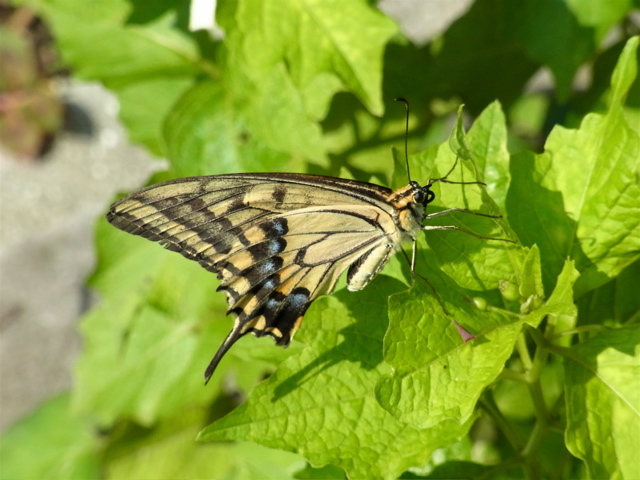 庭を舞う蝶は多くても、広角単焦点のカメラでは、なかなかムズカシイ。そんななか、カメラに望遠が付いてチャンス到来と思ったのは、ちょっと甘かった^^; 動きの速い蝶を望遠で撮るのもムズカシイ。そんななか、やっとキアゲハを写真に収めることができました(写真左:300mm相当)。このところずっと、パセリを食べまくっている幼虫が常時5匹ほどいるけど、これは親か子か、それとも他蝶かしら?