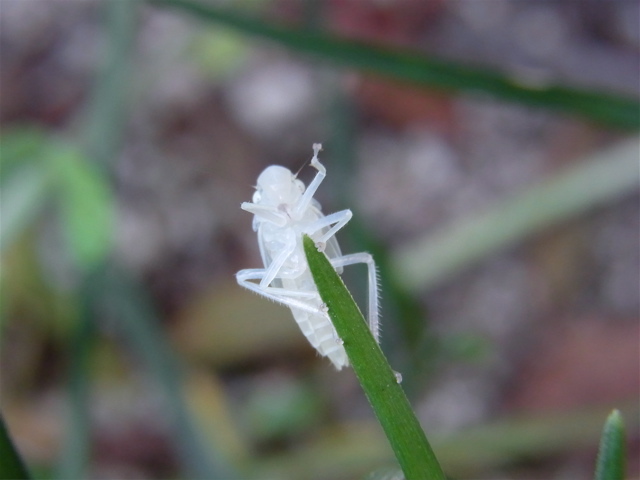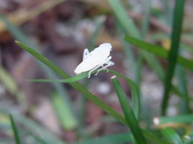 庭でニンジンの収穫をしていると、茂みの奥で何やら白い点が飛び跳ねています。近づいてよくみると、形はどうやらバッタか何からしい。しかし、全身が真っ白。足など透けて見えます。このサイズの子供のバッタなら、普通は薄緑色だと思うのですが・・・。写真に納めたあとよく見ると、目玉だけは黒ですね。ネットで調べても正体不明。遺伝子かなにかのイタズラでしょうか。それにしても、機嫌良く手を振っているように思えるのは、ワタシだけ? それに、指先がめちゃカワイイ^^;