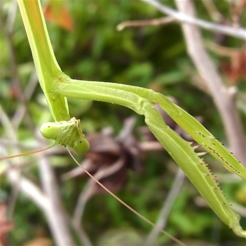 夏椿(シャラの木)の小枝でカマキリを見つけました。見事な保護色ですね。庭の緑と茶色の平均値を体ぜんたいで表現しているかのようです。その上、形も小枝のよう。