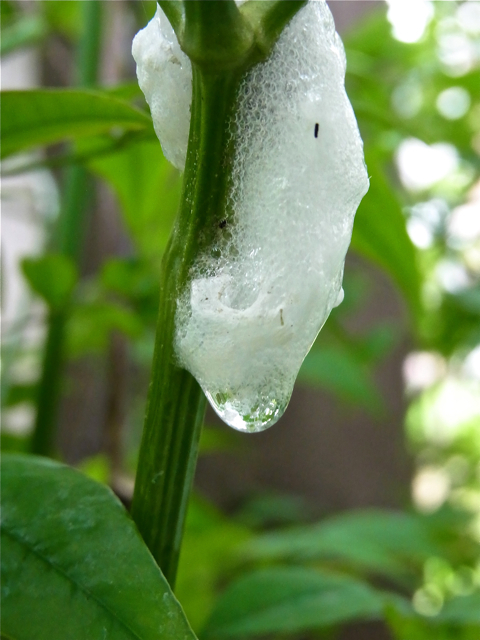 ナンテンの木に、アワフキムシの泡が付いていました。この泡は、中にいるアワフキムシの排泄物によってできたもので、体を泡でつつむことで外的から身を守る効果があるのだそうです。外敵が中の虫を攻めるには泡をくぐらなければならず、そうすると溺死するので近寄れないという仕組みです。じゃあ、中のアワフキムシ自身はどうして呼吸しているかというと、シュノーケルで呼吸しているのだそうです。よく考えたなあというか、すっごい仕組みですねえ^^ なんで泡立つんだろうとか、詳しくはこちらをご参照下さい。