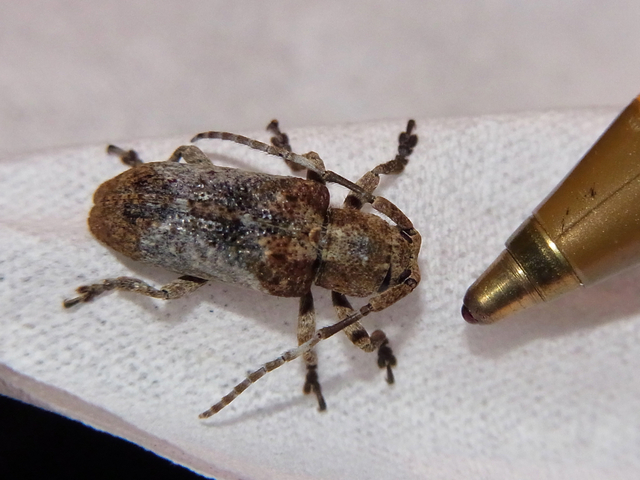 たぶん庭にいた、ナガシロサビカミキリです。たぶんというは、妻のハンドバッグに乗っかって室内にやってきたからです。それで、ティッシュペーパーの上で、ボールペンの先といっしょに写っています。それにしてもちっちゃいですね。そして、しっかり擬態をしています。しかも、擬死をすると触覚を体の脇にたたむので、この状態で撮るのに苦労しました^^