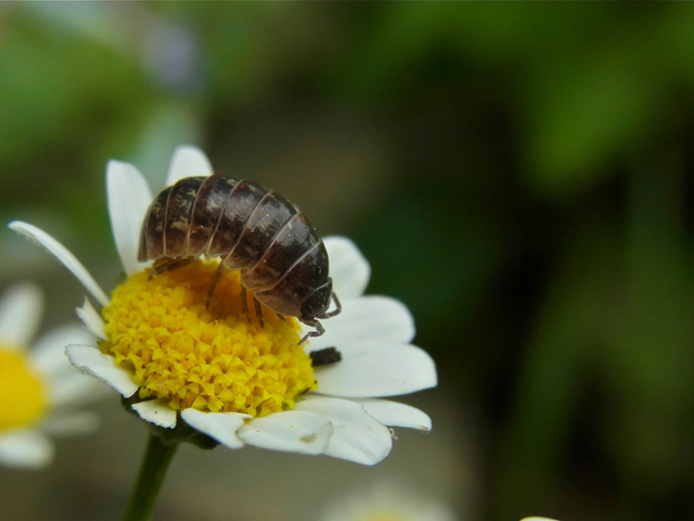 こういうタイトルでいいのかと思いつつ^^; 正体は「花とダンゴムシ」です。この時期になると、ダンゴムシが庭じゅうで大活躍。地面を高速で走るヤツ、ボールのように丸まっているヤツ。ひっくり返って脚をジタバタさせているやつ・・・そして、こんな具合に花の登っているタンゴムシもして、さながら運動会です^^でも、ダンゴムシって、落ち葉や漁肉を好むと聞きますが、写真の姿はまるでハナアブが蜜を舐めているかのようです。ウチのダンゴムシ、よく花に頭突っ込んでいるけど、きっと甘党なんだ^^/