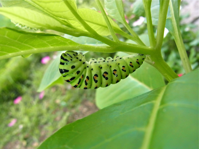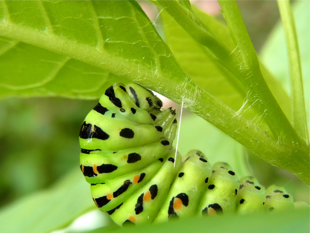 先に蛹になったたぶんキアゲハを紹介しましたが、これは別のキアゲハです。蛹になるために、帯糸とよばれる糸を身体に巻いています。この短い手足でどうやって背中に糸を回すんだろうと思ったら、こんな紹介ビデオがありました。確かにリンボーダンスです。ラジオ体操にもこういう身体をひねる運動がありますね。