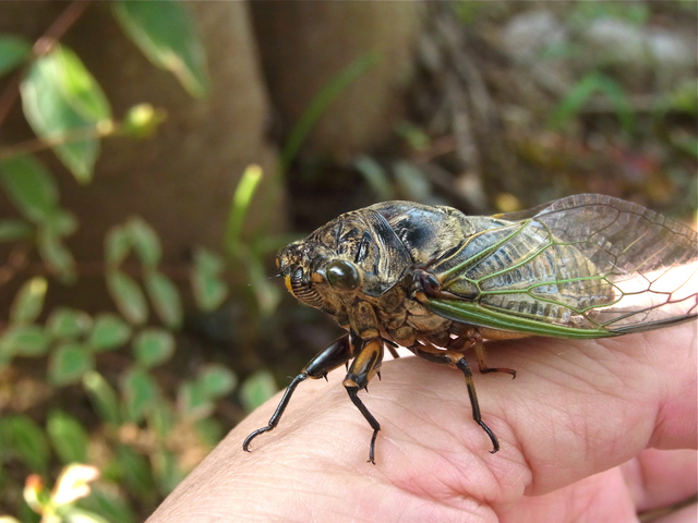 セミついでに、今度はクマゼミです^^;クマゼミはどちらかとうと人が近づいても逃げないような気がしますが、今回も例外ではなく、ずいぶん寄って撮ることができました。けど、寄り過ぎて、なんだか鳥の顔みたいです(笑)というわけで、少し遠景でもと、手の先に乗ってもらいました。手乗り文鳥ならぬ、手乗りクマゼミ^^