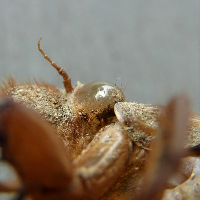 カマキリの抜け殻ついでに、庭のあちこちにある蝉の抜け殻をよく観察してみることにしました。写真は、眼のあたりを拡大したものです。眼を覆う抜け殻の幕に毛が生えているのがわかりますが、これって、抜けたあとの蝉本体にもちゃんと毛があるんでしょうか!? いやはやすごいものです。