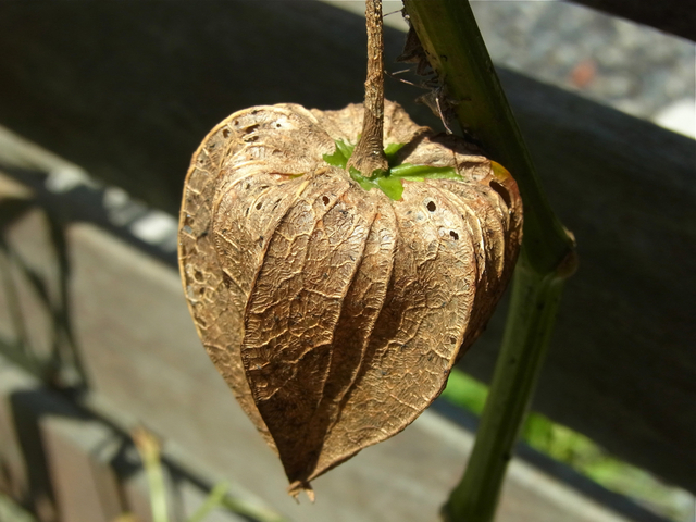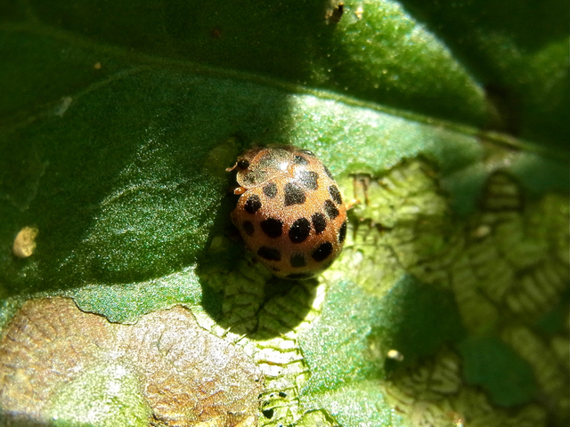 夏に入る前から、菜園回りにあるホオヅキがすごい勢いで生えてきましたが、夏の到来とともに無惨にも枯れ果ててしまいました。その犯人がこれ、ニジュウヤホシテンテトウか、オオニジュウヤホシテントウのいずれかです。ホオヅキはニジュウヤホシテントウの寄生植物のひとつで、猛烈に食われた結果、葉が枯れ、実もこうして朽ち果ててしまいました。トマトの葉の被害はなんとか免れました。
