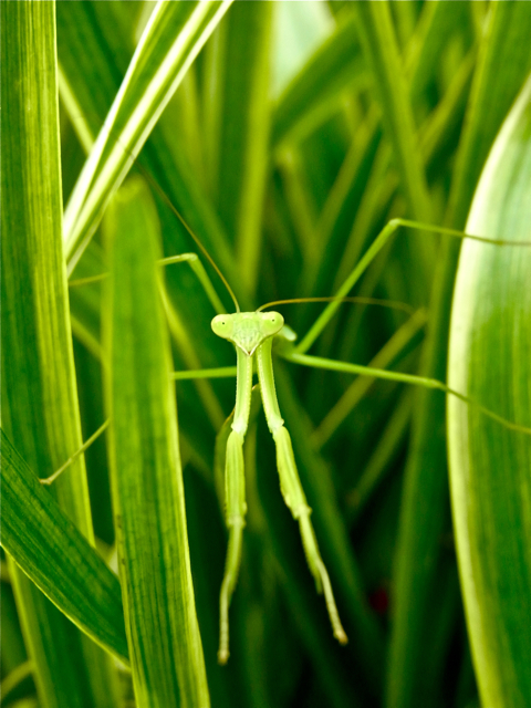 生き生きとしたヤブランに囲まれて、まるで緑の世界の生き物のようです^^ 夏の終わりを告げるように、この日のカマキリもあまり元気がありませんでした。カマキリはどんな気持ちでこちらを見つめていたのだろう。