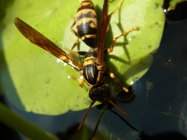 庭の水鉢で水を飲んでいるらしいセグロアシナガバチです。この近くに巣があり、よくここで水を飲むような姿を目にします。蜂が飛行する運動量を考えたら、食料も水もずいぶんいるだろうと思うけど、その割にはずいぶんエネルギー効率がよさそうだなと思います。
