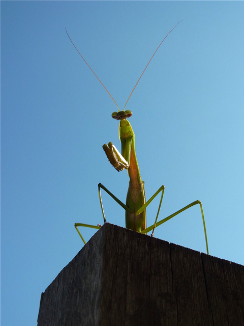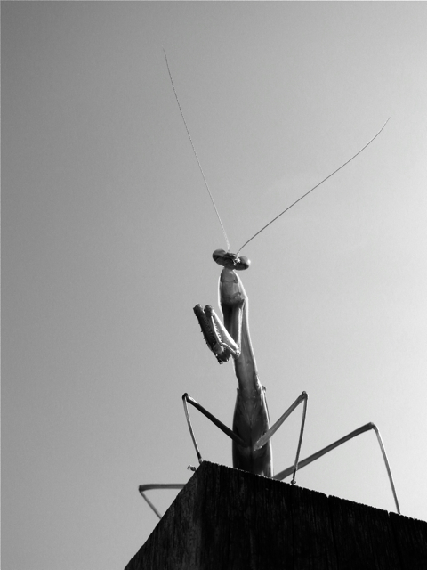 (撮影:8月27日)この姿を見ていると、いろんな呟きを想像してしまう。「あれ、お前はナニ?」とか、「まいったねえ、もう終わりだってさ」とか、「飛ぶに決まってるだろ」とか。たんに「ん?」というのもイイなあの、夕刻の庭の独りあそび^^カラーとモノクロとでは、なんだか見えてくるものも違うようです。