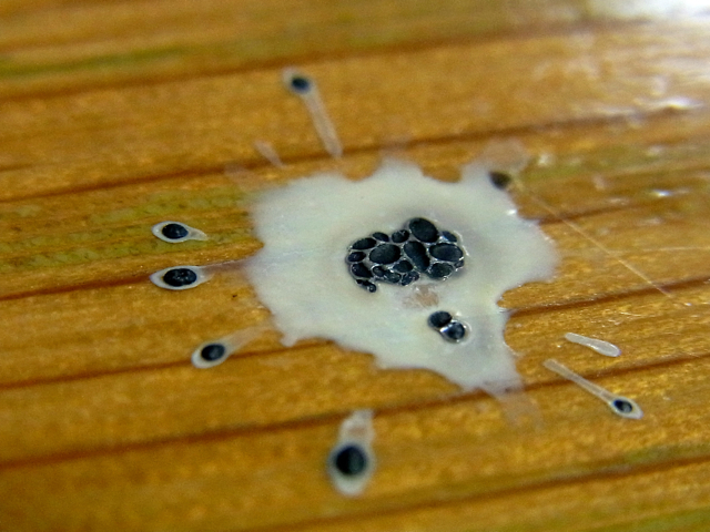 (撮影:9月5日)虫そのものではありませんが、めずらしいものを見つけたので^^ 部屋で生息しているアシダカグモの糞です。通常、アシダカグモの糞は直径3〜4mmの目玉焼き状で、中央が黄身のかわりに黒というパターンです。黒い部分は固形の排泄物で、白い部分は哺乳類では尿にあたるそうです。写真のものはこれまでフローリングなどに残っていた通常のパターンとことなり、上から落ちて飛び散ったように見えます・・・・う〜ん、アシダカグモも下痢になったりするのだろうか???^^;