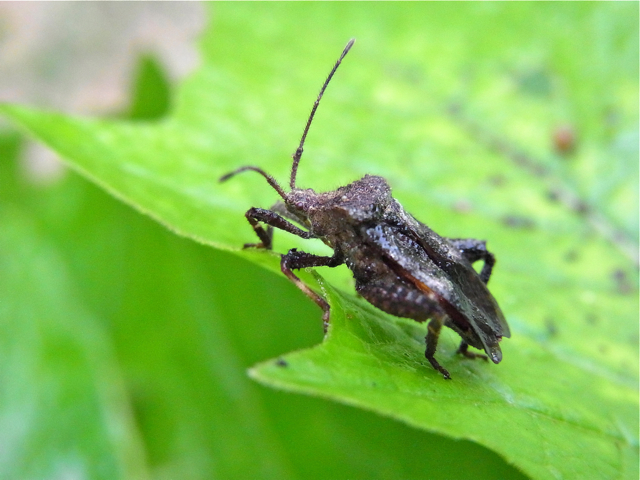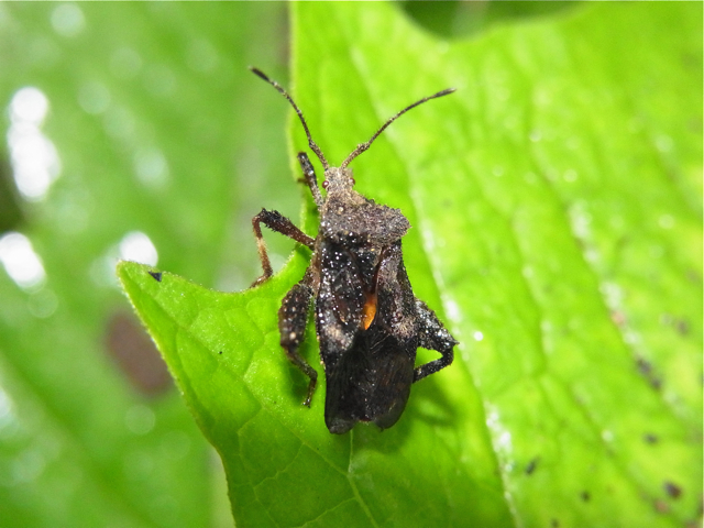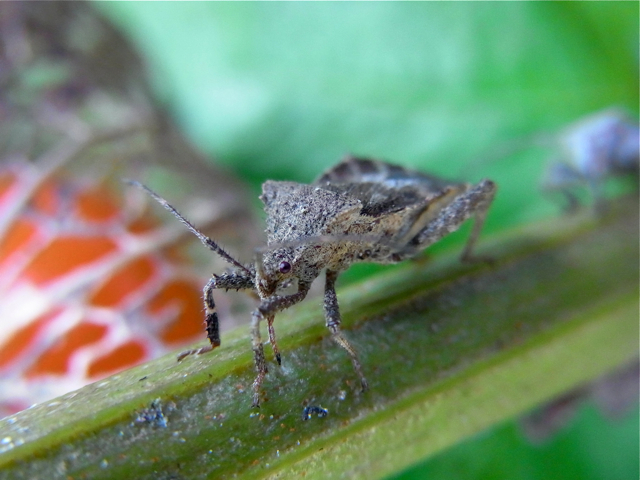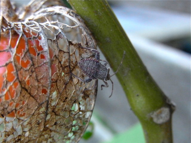 (撮影:9月10日)庭に雑草のことく生い茂るホオズキに、ホオズキカメムシが群れをなしていました。ナス、ピーマン、ジャガイモなどの害虫ですが、農薬散布をしない家庭菜園で見かけることが多いようです。左下の写真のように、ホオズキの茎からも汁を吸っています。でも、ホオズキの被害という点では、葉を食い荒らすニジュウヤホシテントウの方がはるかに破壊力は大です。テントウムシの方が、顔形はずっと愛嬌があるんですけどね。