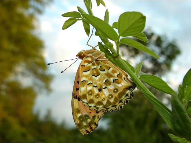 散歩道で見つけた、おなじみのツマグロヒョウモンです。お伴にしたケンのリードを足で押さえ、地面に這いつくばりながらパシャ。ケンにウロチョロされて、なかなかシャッターチャンスがありませんでした。ちゃんと躾けなきゃ^^;