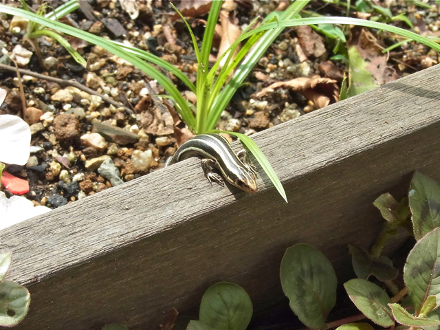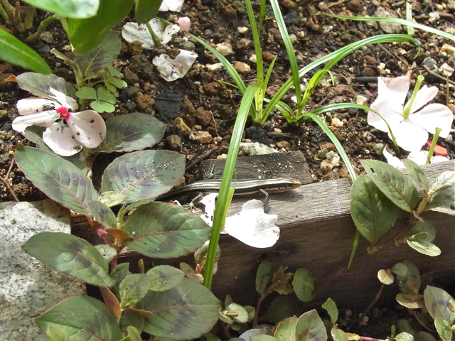 見かけることが多いニホンカナヘビではなく、ニホントカゲです。光沢があり、とくに尻尾がきれいなメタルブルーに輝いています。非常に動きが早く敏感なため、なかなかうまく写真を撮ることができません。こんなとき、性能のいい望遠マクロがあったらなあと思います。