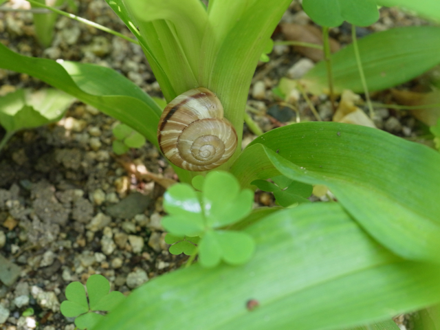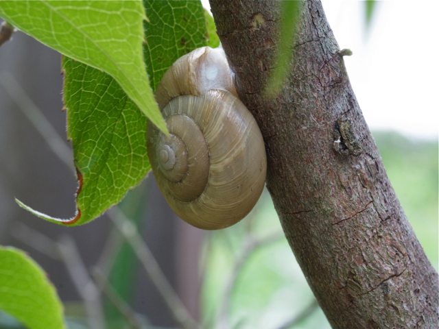 一週間で地面近くの植物から、1.5mほどの庭木に移動した同じカタツムリ、かな? 模様が違うからどうなんだろう。