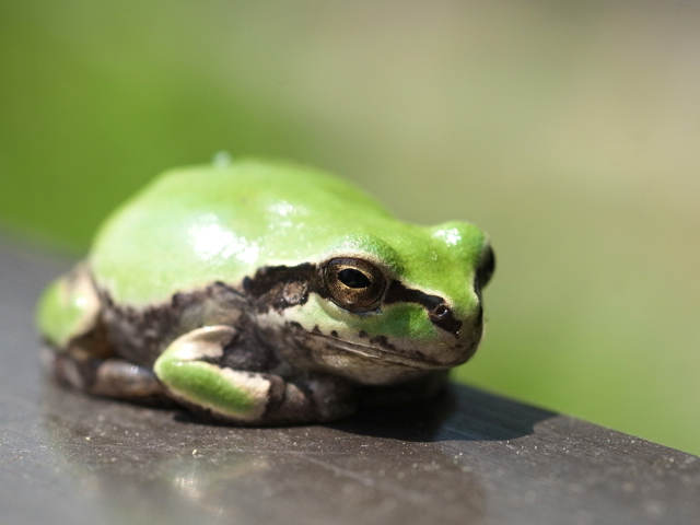 手摺の上で置物と化した雨蛙。座り心地悪かろうに、庭の葉っぱの上で撮らせてほしいんだけど、と思うのは人間の勝手^^