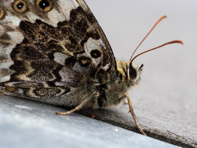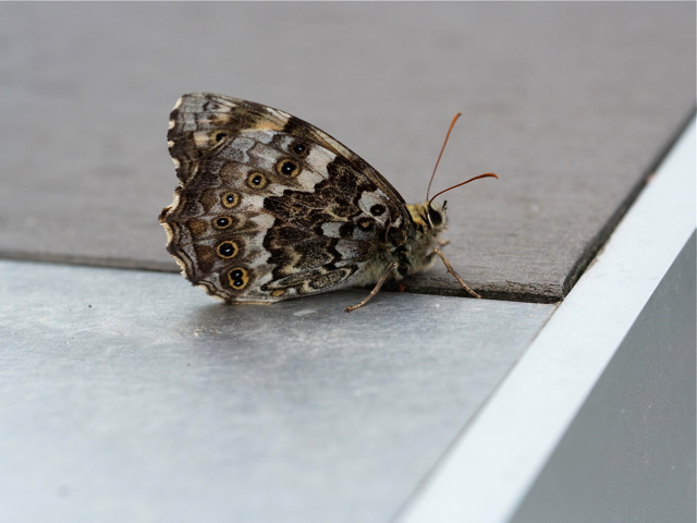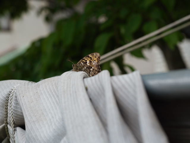 (撮影:5月13日)庭のテーブルにお客さま。たぶん、サトキマダラヒカゲ。ぼくのGXR+MOUNT A12のマクロ環境では、このあたりが限界^^ P10だともっとうまく撮れるかもしれないけど、なぜかマニュアルで撮りたくなります。