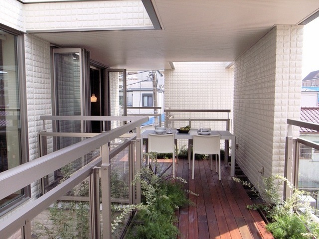階段を登って目前に広がったスペースを見て、「お、おー」ですね。いや、バッチリ決まっています。白い外壁、木質のデッキ、緑の植栽、そして高所から見渡せる外部空間。そのなかに置かれたクッキンガーデンのシンプルな佇まいに、なんの矛盾もありません。