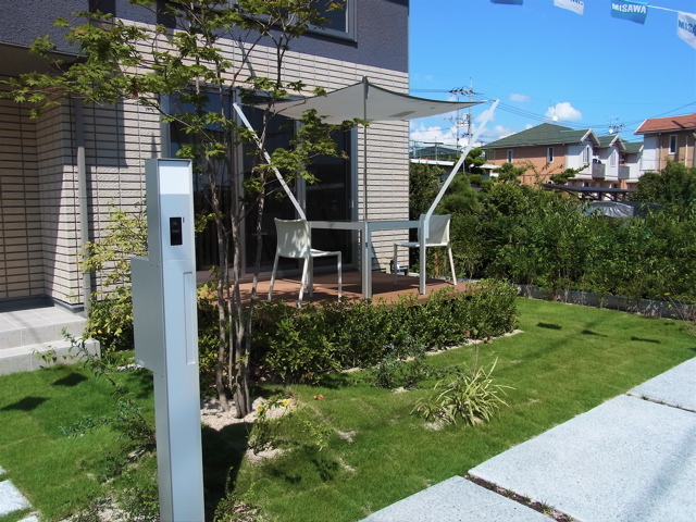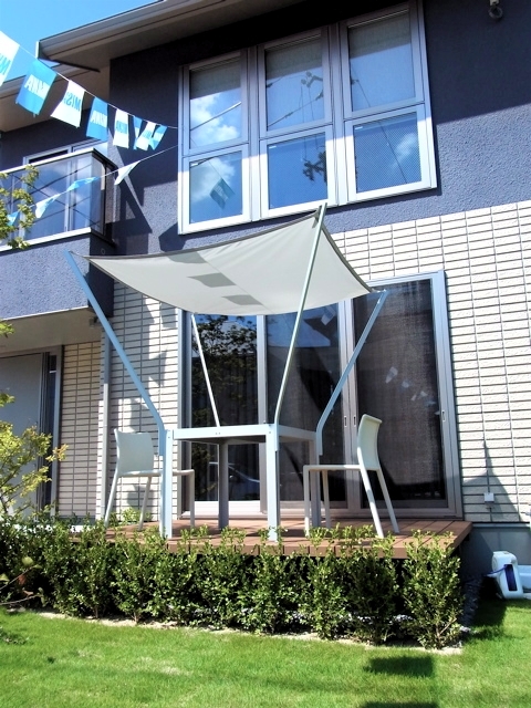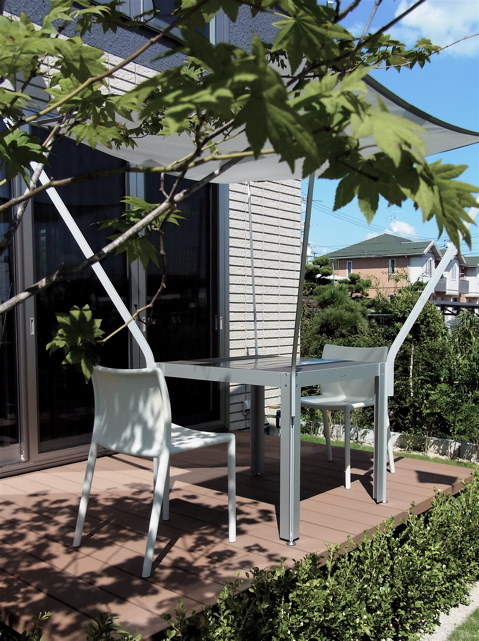 今回のプランは2坪タイプ。クッキンガーデンのT8080テーブルとシェード、そしてマジスの椅子がセットになっています。デッキ周りの植栽、芝生もバランスよく配置されています。