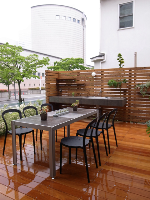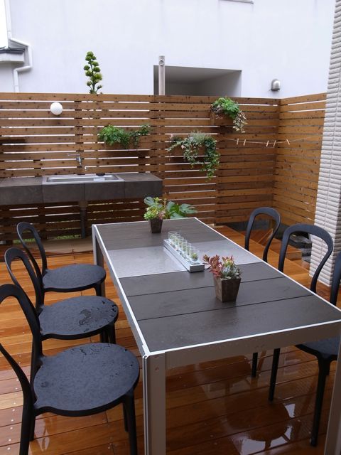 デッキスペースにはシンクが設けられています。チェアはアクタスのもので、シンクのタイルやダイニングのチェアとテイストを揃える為にブラックが選ばれています。さらに右下の写真(提供:旭化成ホームズ(株))のように、支柱に三角形のタープを取り付けることでテーブル回りに適度な影ができるように設計されています。