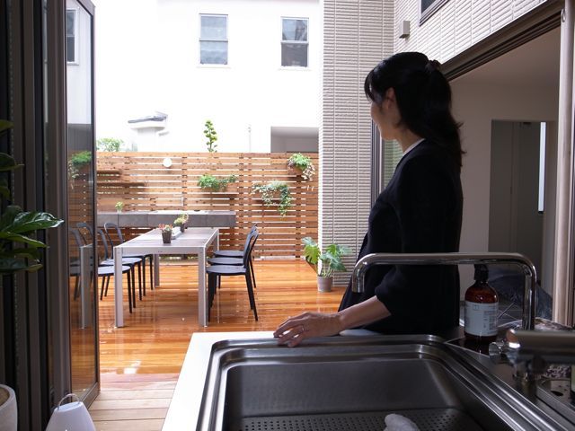 クッキンガーデンのテーブルは、旭化成ホームズ(株)横浜デザインオフィスの展示棟の玄関奥、キッチンスペースに接続するデッキの上に置かれています。来客をそのまま玄関からデッキのテーブルにお迎えし、楽しい庭ごはんがすぐにでもはじまるような、自然で親しみのあるレイアウトがとても魅力的です。