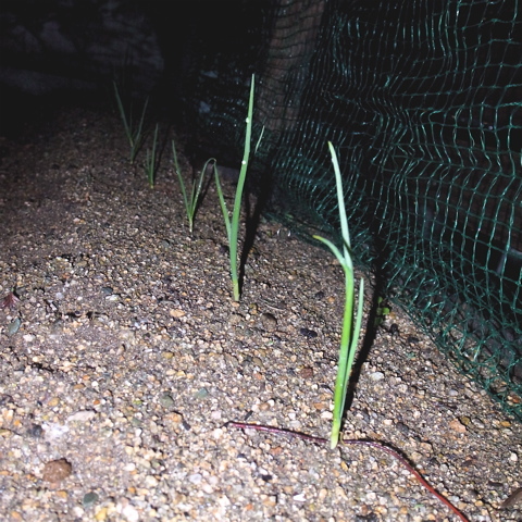 タマネギの苗床の土は、一坪菜園の土と「畑懐の土」をまぜたものでした。播種の適期を外れたため成長は遅いですが、定植後、なんとか普通の土の菜園で成長しています。写真は、いましがた雨のなかで撮影した菜園のタマネギです^^。