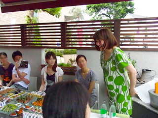そして、いよいよメインイベント、若林三弥子さんの登場です。この日の若林さんは彼女のマイカラーのグリーンを基調に、まるで梅雨の季節を遊ぶかのような大胆な柄のワンピース。見慣れたせいか、グリーンは本当に若林さんそのものという印象です。