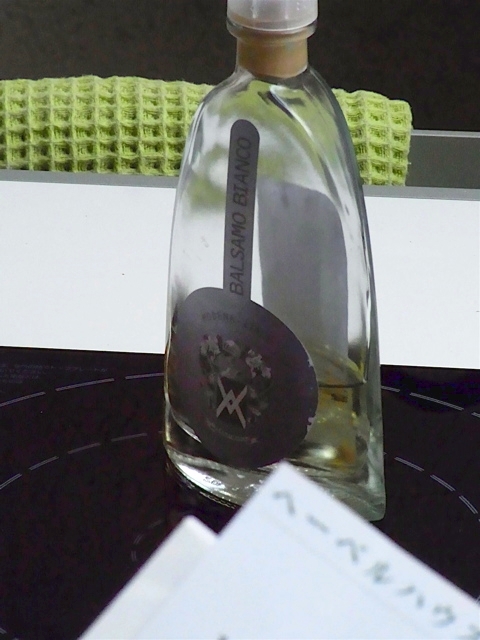 最後の写真は、若林さんおすすめの「白いバルサミコ酢」です。これは市販のものですが、ほんとうに美味です。料理にどう使うかを聞き逃したのが残念です。