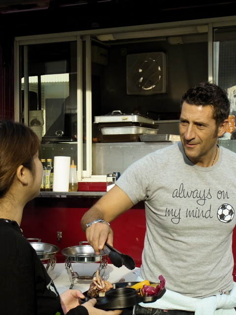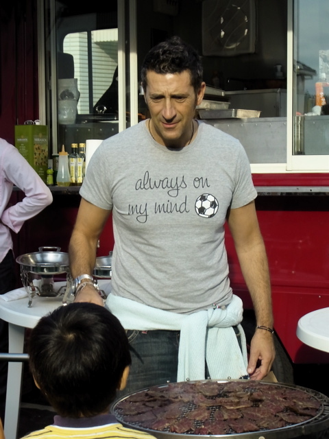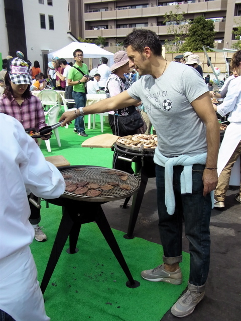 Tシャツにシーンズ姿で、煙に顔をしかめながら肉を焼くジローラモさん、しかめっ面が絵になりますねえ(笑)。でも、子供さんがやってくると一瞬でニコニコ顔。もちろん、女性にお肉をサーブするときはニヤケ顔。写真にその表情の違いがでているかも^^