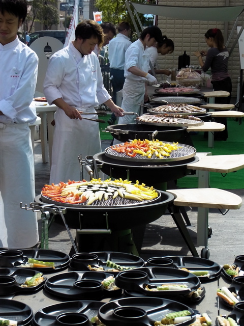 まずは居並ぶ料理スタッフ(左上)。炭焼きグリル1台にひとりのシェフ姿、こうしてずらりと並ぶと圧巻ですね。このグリル、DLDさんのスペースグリル600iです。デザインもカッコ良く、ドーム上にふくらんだ焼き網のおかげで、焼け具合も良好でした。