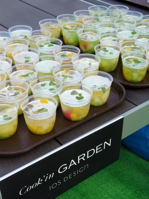 左下は季節の果物で作ったフルーツポンチonクッキンガーデン^^。アクセントにマチュドニアミントが入っています。とてもさわやかな一品で、庭のデザートはピッタリの風味でした。