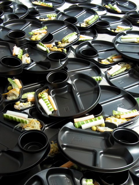 右下は、お客様ひとりひとりに料理をお持ちいただくためのトレーに、サラダだけを乗せてスタンバイの様子です。これも、これだけ数が集まるとすごいですね〜。
