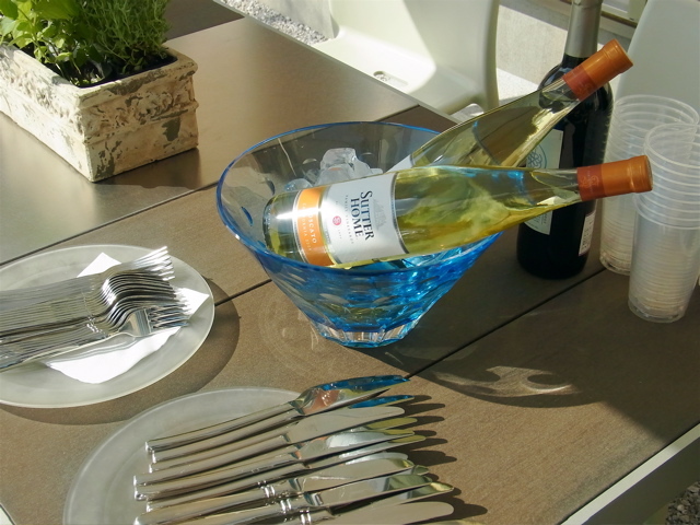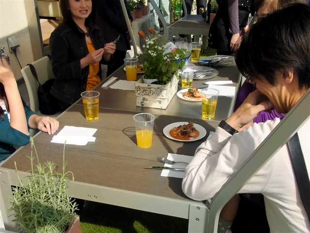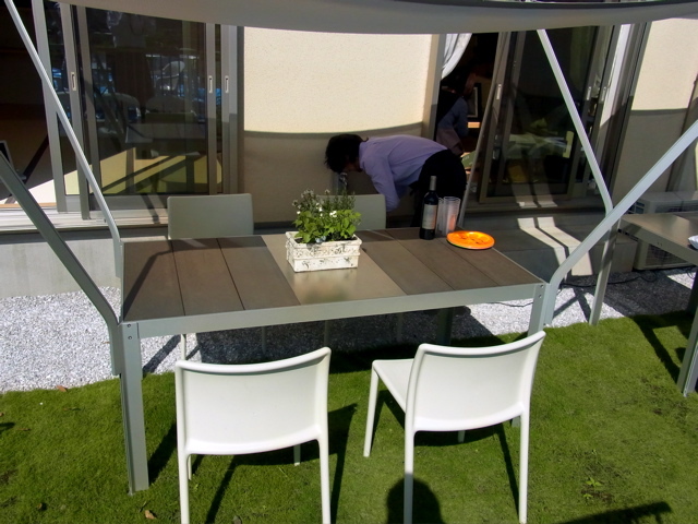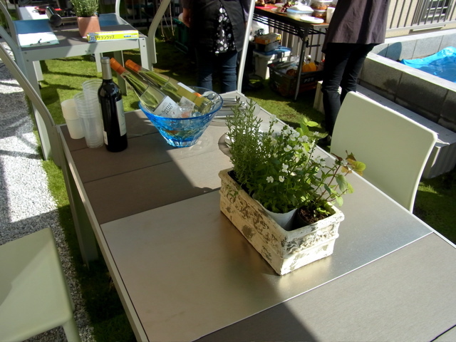 写真でご覧の通り、掃き出し窓口から敷地境界までは3.5mほど。その芝生の上にクッキンガーデンのテーブル二台(T1608とT8080)、それにIHワゴンと正方形ワゴンとところ狭し。それでも20名近くの方に着席いただくのはむずかしく、お隣さんの更地に丸テーブルを配置して、いよいよはじまり、はじまり〜^^