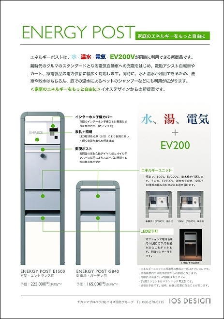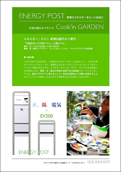 展示品は、クッキンガーデンセットプランの4坪タイプと、新商品のエネルギーポストです。このエネルギーポスト、最新の電気自動車を意識したものですが、なんと、水とお湯がでます! たぶん、世界初。EVの普及にはまだ時間がかかりそう。なので、あるようでなかった「水、お湯、電気」をポストにまとめてみましたという商品です^^