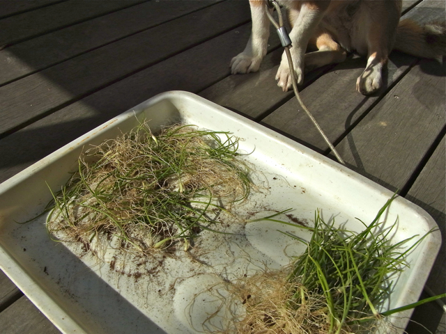 まずは苗床の土をほぐして苗を選別します。小さいのは涙をのんでお別れ。選別作業の近くで見守っているのは我が家のモモちゃんです。