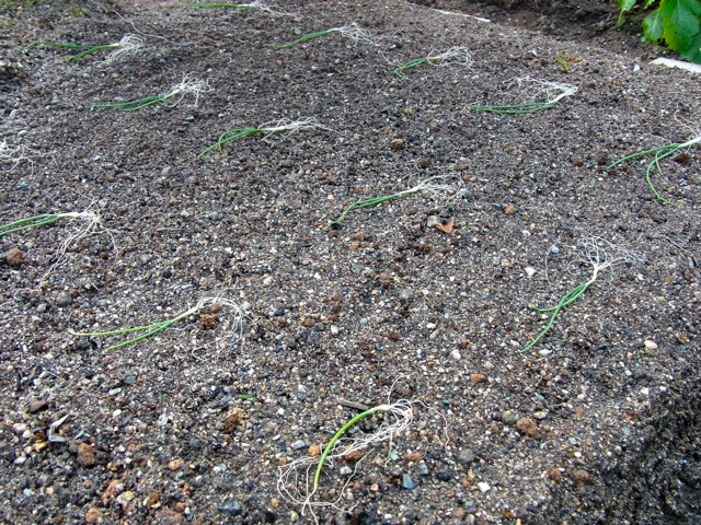 小さいネギの苗を植えるのは、意外とむずかしいですね。根がすごく長くて穴に押し込むのがけっこうたいへんだし、浅すぎても深すぎてもダメという加減もむずかしい。でもまあ、なんとか植え終わりました。