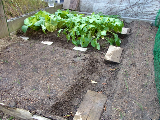 選別した苗を、用意しておいた畝の上に並べます。全部で43株だったかな。正方形の畝と長細い畝に、いま収穫時期を迎えているカブと、もう少しで収穫できそうな白菜、それと、土のなかでドーなっているかわからないニンジンさんを取り囲む様に植えました。
