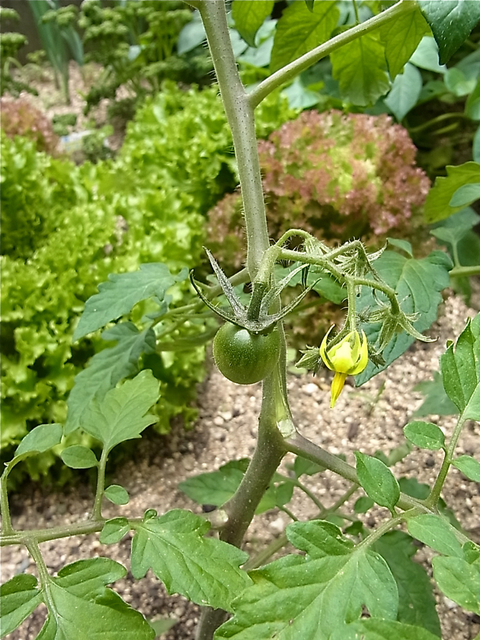 二本の苗のうちデルモンテ苗の方に実が付きました。よく見ると三つ付いています。ついでに、伸びはじめた脇芽も摘みました。ここ二年ほどはミニトマトだったので、中玉と大玉がどうなるか楽しみです。