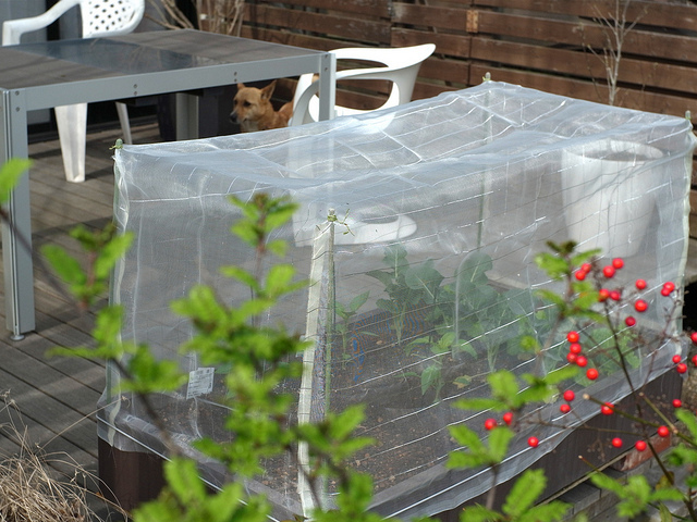 (撮影:4月15日)デッキの上の大型プランターに、虫と鳥を避けるための網を設置しました。ブロッコリーやキャベツは鳥に狙われやすいので、網があると安心です。網は市販のものを購入し、網の四隅の合わせはいつもどおり両面テープという安直さですが、十分機能します。ただし、プランターの下から上がってくるナメクジを防止するには、プランター箱と網を隙間なく合わせる必要があります。今回はそこまではやれなかったので、ナメクジ対策にはなっていません^;